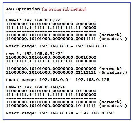 এটা অত্যাবশ্যকীয় নিয়ম। ধরুন, যদি আমরা 32/25 সাবনেট করে মনে করে ফেলি আমাদের সাবনেট রেঞ্জ 192.168.0.32 – 192.168.0.159 সঠিক আছে, তাহলে আমাদের ধারণা ভূল। (Figure-3)