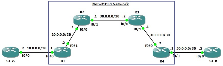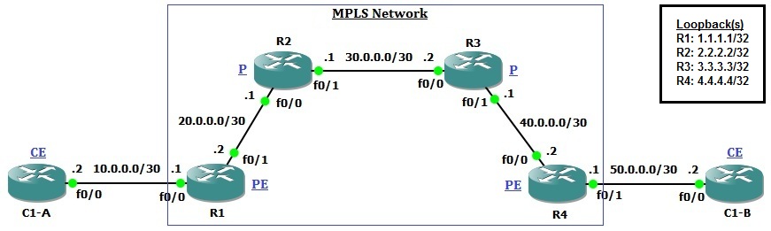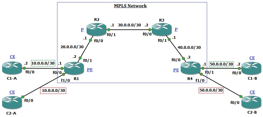 ধরি চিত্রে প্রদত্ত টপোলজি অনুযায়ী, একটি আই.এস.পি এর নেটওয়ার্কে চারটি রাউটার আছে। আই.এস.পি এর একটি ক্লায়েন্ট Client-1 দুইটি ভিন্ন লোকেশনে থাকা অফিসের মধ্যে কানেক্টিভিটি নেবে। আই.এস.পি এর R1 রাউটারের সাথে ক্লায়েন্টের C1-A (Site-A) রাউটার যু্ক্ত এবং আই.এস.পি এর R4 রাউটারের সাথে ক্লায়েন্টের C1-B (Site-B) রাউটার যু্ক্ত।