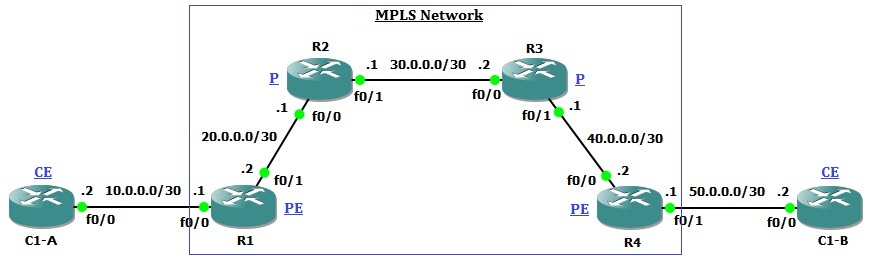 আমাদের টপোলজি অনুযায়ী, ক্লায়েন্ট রাউটার C1-A ও C1-B হলো CE রাউটার, আই.এস.পি এর R1 ও R4 হলো PE রাউটার এবং R2 ও R3 হলো P রাউটার।
