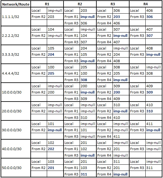 R1#show mpls forwarding-table Local Outgoing Prefix Bytes Label Outgoing Next Hop Label Label or Tunnel Id Switched interface 100 205 4.4.4.4/32 0 Fa0/1 20.0.0.1 101 Pop Label 30.0.0.0/30 0 Fa0/1 20.0.0.1 102 202 40.0.0.0/30 0 Fa0/1 20.0.0.1 103 201 50.0.0.0/30 0 Fa0/1 20.0.0.1 104 Pop Label 2.2.2.2/32 0 Fa0/1 20.0.0.1 105 204 3.3.3.3/32 0 Fa0/1 20.0.0.1