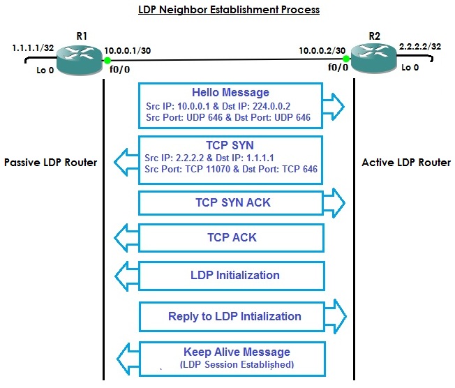 প্রথমে R1 রাউটার R2 এর কাছে একটি Hello ম্যাসেজ পাঠায়। যার সোর্স আই.পি 10.0.0.1 (যা R1 এর নিজের আই.পি) এবং ডেষ্টিনেশন আই.পি 224.0.0.2 (যা একটি All Router’s Multicast আই.পি)। যার সোর্স পোর্ট UDP 646 এবং ডেষ্টিনেশন পোর্টও UDP 646 । এই Hello ম্যাসেজের মধ্যে R1 এর Label Switch Router ID (LSR ID) থাকে। এই LSR ID টি রাউটারের Transport এ্যাড্রেস হিসেবেও ব্যবহৃত হয়। এখানে R1 এর LSR ID বা Transport এ্যাড্রেস হলো 1.1.1.1 যা ইহার Highest Loopback IP । এভাবে Hello ম্যাসেজ আদান প্রদান করে যখন দুইটি রাউটার একে অন্যের সাথে পরিচিত হয় তখন এরা নিজেদের LSR ID এর উপর ভিত্তি করে Active LDP Router/Passive LDP Router মুডে গমন করে। এখানে R1 এর LSR ID হলো 1.1.1.1 এবং R2 এর LSR ID হলো 2.2.2.2 । যার LSR ID বড় সে হয় Active LDP Router এবং যার LSR ID ছোট সে হয় Passive LDP Router । আমাদের টপোলজি অনুযায়ী R1 ও R2 এর মধ্যে R2 এর LSR ID বড়, তাই R2 হবে Active LDP Router এবং R1 হবে Passive LDP Router ।
