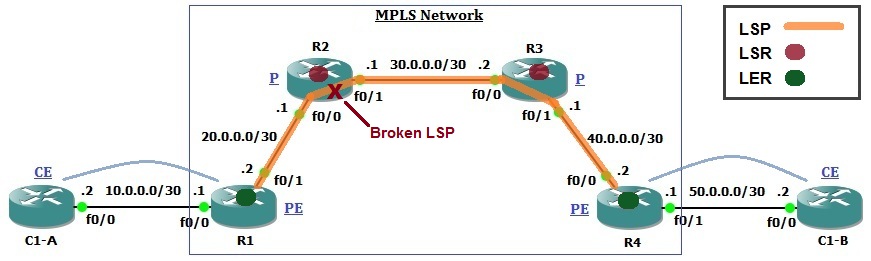 এখন R1 রাউটার থেকে R4 রাউটারের কানেক্টিভিটি চেক করার জন্য Ping দিলে Ping পাওয়া যাবে। কারণ R2 রাউটারে MPLS বন্ধ থাকলেও প্যাকেট ফরোয়ার্ড করার ক্ষেত্রে কোন সমস্যা হবে না। এক্ষেত্রে R2 রাউটার LFIB এর পরিবর্তে শুধুমাত্র FIB টেবিল Lookup করে প্যাকেট ফরোয়ার্ড করবে। এবং Traceroute রিপোর্টে শুধুমাত্র রাউটারের আই.পি দেখা যাবে কিন্তু এর সাথে কোন MPLS Label দেখাবে না। একে Broken Label Switch Path বলে।
