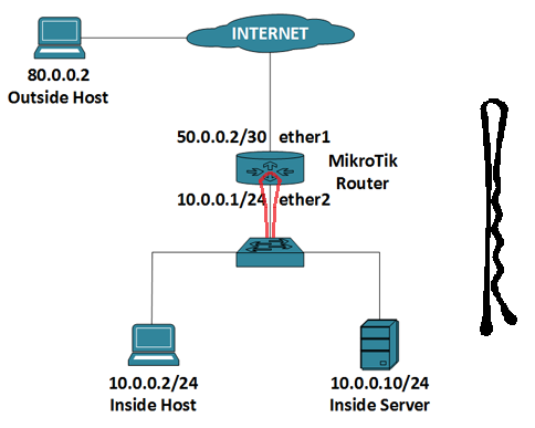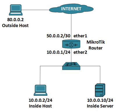 /ip address add address=50.0.0.2/30 interface=ether1 add address=10.0.0.1/24 interface=ether2 /ip route add dst-address=0.0.0.0/0 gateway=50.0.0.1 /ip firewall nat add chain=srcnat src-address=10.0.0.0/24 action=src-nat to-addresses=50.0.0.2