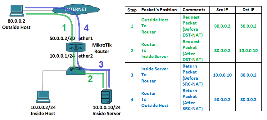 ধাপ-২: রিকোয়েষ্ট প্যাকেটটি যখন মাইক্রোটিক রাউটারের কাছে আসে তখন রাউটার Dst-NAT এর রুল অনুযায়ী প্যাকেটটিকে 10.0.0.10 এর কাছে ফরোয়ার্ড করে। এক্ষেত্রে প্যাকেটটির সোর্স আই.পি হয় 80.0.0.2 এবং ডেষ্টিনেশন আই.পি হয় 10.0.0.10 । একটি কথা বিশেষভাবে উল্লেখ্য যে, Src-NAT এর সময় রাউটার প্যাকেটের সোর্স আই.পি পরিবর্তন করে এবং Dst-NAT এর সময় রাউটার প্যাকেটের ডেষ্টিনেশন আই.পি পরিবর্তন করে। এখানে তাই রাউটার প্যাকেটের ডেষ্টিনেশন আই.পি পরিবর্তন করেছে।