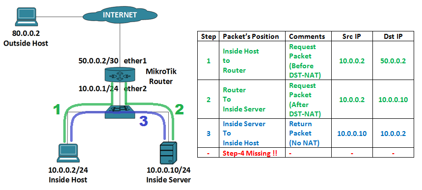 Dst-NAT কনফিগার করার পর আমরা ইন্টারনেটের যেকোন লোকেশন থেকে 50.0.0.2:8080 এই URL টি ব্যবহার করে ওয়েব সার্ভারটি এ্যাক্সেস করতে পারবো। কিন্তু এখানে একটি সমস্যা হলো যে, আমাদের ল্যান এর কম্পিউটার থেকে 50.0.0.2:8080 এই URL টি ব্যবহার করে আমরা ওয়েব সার্ভারটি এ্যাক্সেস করতে পারবো না। ল্যান এর কম্পিউটার থেকে 10.0.0.10:8080 এই URL টি ব্যবহার করেই আমাদেরকে ওয়েব সার্ভারটি এ্যাক্সেস করতে হবে। এরকমটি হওয়ার কারণ কি এবং কিভাবে এই সমস্যা সমাধান করা যায়, এবার তা নিয়ে আমরা বিস্তারিত বুঝার চেষ্টা করবো।