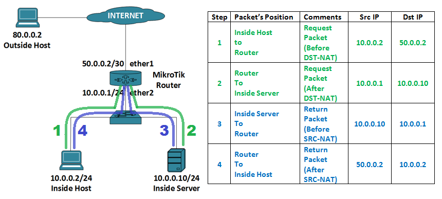 ধাপ-৪: রিপ্লাই প্যাকেটটি যখন রাউটারের কাছে পৌছাবে তখন রাউটার তার Src-NAT এর রুল অনুযায়ী প্যাকেটটির সোর্স আই.পি পরিবর্তন করে ইন্টারনেটে পাঠিয়ে দিবে। এক্ষেত্রে প্যাকটটির সোর্স আই.পি হবে 50.0.0.2 এবং ডেষ্টিনেশন আই.পি হবে 80.0.0.2 । যখন ইন্টারনেট হোষ্ট রিপ্লাই প্যাকেট পাবে তখন সে প্যাকেটটিকে রিসিভ করবে। অর্থাৎ, একটি সফল কমিউনিকেশনের সমাপ্তি।