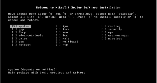 স্ক্রীণ এ লক্ষ্য করলে দেখবেন কিছু ইন্সট্রাকশন ও প্যাকেজসমূহের তালিকা দেওয়া আছে। যেমনঃ কার্সর মুভ করানোর জন্য p ও n প্রেস করতে হবে, কোন প্যাকেজ সিলেক্ট করার জন্য Spacebar প্রেস করতে হবে, সবগুলো প্যাকেজ একসাথে সিলেক্ট করার জন্য a প্রেস করতে হবে, ইন্সটলেশন প্রসেস শুরু করার জন্য i প্রেস করতে হবে, রাউটার রিবুট করার জন্য q প্রেস করতে হবে।