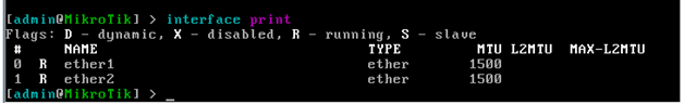 এজন্য প্রথমেই আমরা > interface print কমান্ডের মাধ্যমে রাউটারে কয়টি interface আছে তা দেখে নেব।
