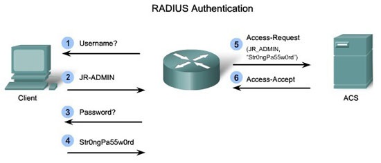 নিচের চিত্রে TACACS+ ও RADIUS এর কার্যপ্রণালীর ধাপসমূহ উল্লেখ করা হলোঃ