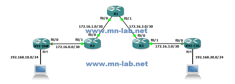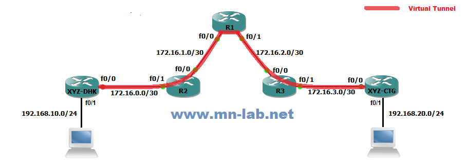 চিত্রে R1, R2 ও R3 একটি আই.এস.পি এর তিনটি রাউটার। এর মধ্যে R1 হলো কোর রাউটার, R2 হলো ঢাকার একটি POP এবং R3 হলো চট্টগ্রামের একটি POP । XYZ নামে একটি কোম্পানী এই আই.এস.পির কাছ থেকে ঢাকায় নিজেদের হেড অফিসে একটি কানেকশন নিয়েছে এবং চট্টগ্রামে নিজেদের ব্রাঞ্চ অফিসে একটি কানেকশন নিয়েছে্। এই XYZ নামক কোম্পানীর মূল উদ্দেশ্য হলো তাদের ঢাকা অফিস ও চট্টগ্রাম অফিসের মধ্যে ডাটা আদান-প্রদান করা।