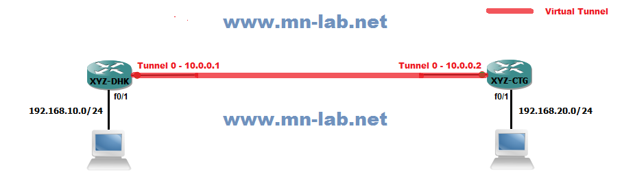 এখন আমরা GRE Tunnel কনফিগার করবো। প্রথমে XYZ-DHK রাউটারে কনফিগার করি।