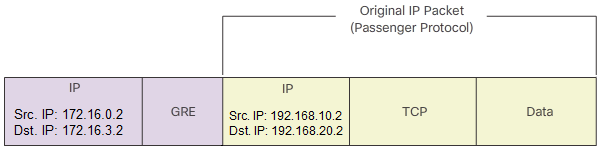 ৩. কিন্তু “Tunnel 0” ইন্টারফেসটি যেহেতু একটি লজিক্যাল VPN ইন্টারফেস, তাই রাউটার প্রথমেই “Tunnel 0” ইন্টারফেসটির কনফিগারেশন অনুযায়ী মূল আই.পি প্যাকেটটির Network Layer এর Header (Original Header) এর উপর আরো একটি অতিরিক্ত Header (Outer Header/GRE Header) যোগ করবে যার সোর্স আই.পি হবে 172.16.0.2 এবং ডেষ্টিনেশন আই.পি হবে 172.16.3.2 ।