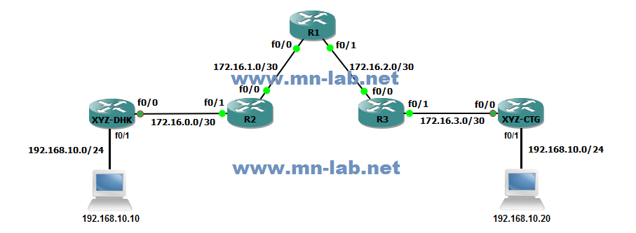 চিত্রে R1, R2 এবং R3 হলো আই.এস.পি নেটওয়ার্কের তিনটি রাউটার। আই.এস.পি নেটওয়ার্কে থাকা রাউটারসমূহের মধ্যে ডায়নামিক রাউটিং প্রটোকল কনফিগার করা থাকে। এর ফলে আই.এস.পি নেটওয়ার্কে থাকা একটি রাউটার আরেকটি রাউটারকে চিনতে পারে। চিত্রে প্রদত্ত টপোলজি অনুযায়ী, আই.এস.পি রাউটারসমূহের মধ্যে OSPF কনফিগার করা হয়েছে। R1 এর সাথে XYZ কোম্পানীর ঢাকা অফিস যুক্ত (XYZ-DHK রাউটার) যার পয়েন্ট-টু-পয়েন্ট আই.পি ব্লক 172.16.0.0/30 এবং R3 এর সাথে XYZ কোম্পানীর চট্টগ্রাম অফিস যুক্ত (XYZ-CTG রাউটার) যার পয়েন্ট-টু-পয়েন্ট আই.পি ব্লক 172.16.3.0/30 ।