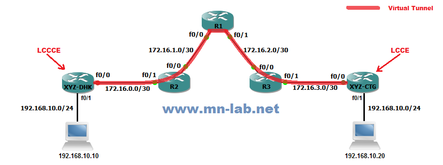 চিত্রে প্রদত্ত টপোলজি অনুযায়ী, ক্লায়েন্ট XYZ এর ঢাকা এবং চট্টগ্রামের রাউটারদ্বয়ের মধ্যে অর্থাৎ 172.16.0.2 এবং 172.16.3.2 এর মধ্যে L2TPv3 টানেল কনফিগার করা হবে। এখানে, 172.16.0.2 এবং 172.16.3.2 উভয় End-Point ই সংশ্লিষ্ট রাউটারের ফিজিক্যাল ইন্টারফেসের আই.পি। কিন্তু এই End-Point হিসেবে রাউটারের Loopback ইন্টারফেসের আই.পি ব্যবহার করা ভালো। কারণ, Loopback ইন্টারফেস কখনো DOWN হয় না। এছাড়াও ফিজিক্যাল ইন্টারফেসে আই.পি এ্যালিয়াসিং (একই ইন্টারফেসে একাধিক আই.পি) করা থাকলে অথবা Redundancy এর জন্য একাধিক WAN লিঙ্ক থাকলে End-Point হিসেবে Loopback ইন্টারফেসের আই.পি ব্যবহার করতে হয়। তবে সেক্ষেত্রে রাউটারদ্বয়ের Loopback ইন্টারফেসের আই.পি সমূহের মধ্যে অবশ্যই রাউটিং রিচেবিলিটি থাকতে হবে। আমরা আমাদের টপোলজিতে End-Point হিসেবে Loopback ইন্টারফেসের আই.পি ব্যবহার করি নাই (যেহেতু এটি অপশনাল)।